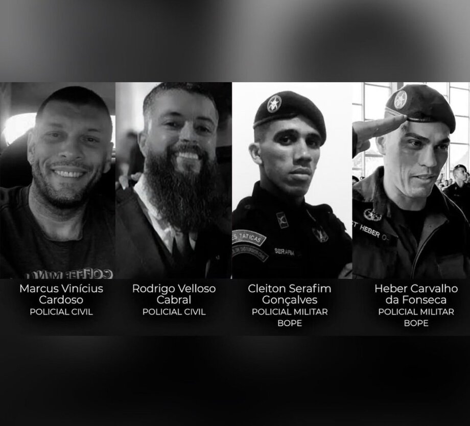 Os policiais militares foram identificados como Cleiton Serafim Gonçalves, de 40 anos, e Heber Carvalho da Fonseca, de 39 anos. Eles eram integrantes do Batalhão de Operações Policiais (Bope). Ambos deixam esposa e filhos."Hoje, a dor da sua ausência é imensurável e nos rasga a alma, mas preciso encontrar forças para te dizer adeus e honrar a memória de quem você foi: um herói em sua profissão e um gigante em nossa vida... Sua dedicação como Policial Civil era a prova do seu coração corajoso. Você partiu cumprindo sua missão de proteger a sociedade, e isso é um legado de bravura que jamais será esquecido. Você era um homem de princípios, de fibra e de uma coragem que inspirava a todos.