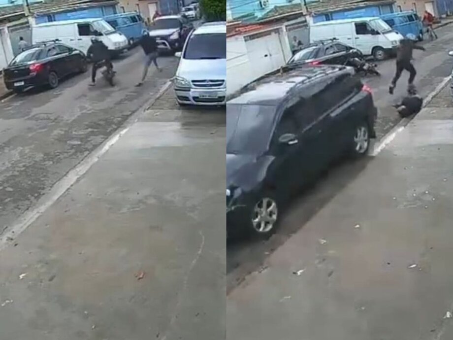 Após o impacto, ele ainda dá ré e passa novamente por cima do suspeito. O segundo homem abandona a moto, tenta pegar algo na cintura do comparsa caído, mas quase é atropelado também e acaba fugindo correndo.