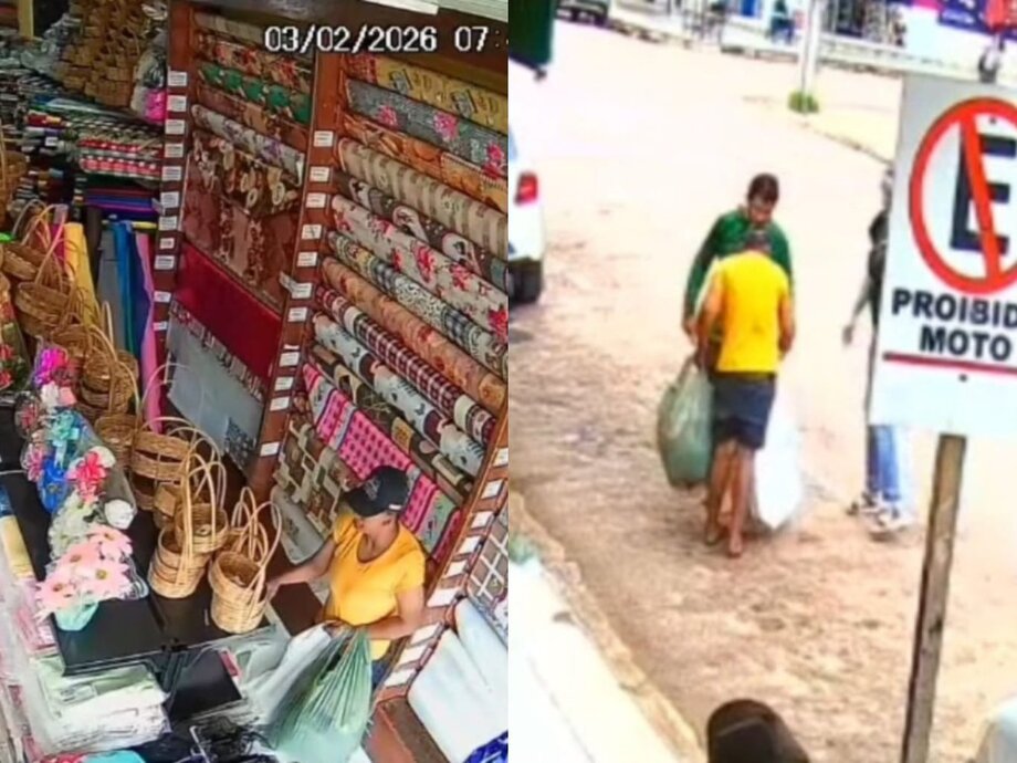 Imagens mostram o momento em que a mulher entra no estabelecimento, recolhe alguns produtos e sai da loja com uma sacola contendo os itens. Pouco tempo depois, a proprietária conseguiu alcançá-la e recuperar a mercadoria.