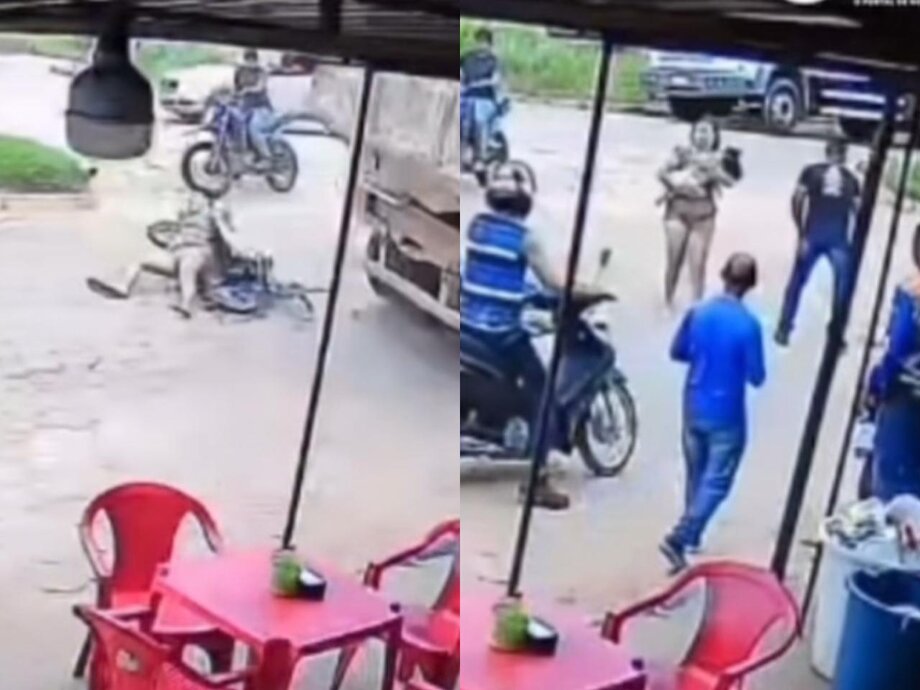 Um grave acidente de trânsito registrado nesta quinta-feira (5), em Tucumã, no sul do Pará, deixou uma criança de cerca de 1 ano em estado grave. A colisão envolveu uma motocicleta, onde estavam uma mulher e a criança e uma caçamba. O momento do impacto foi flagrado por câmeras de monitoramento.