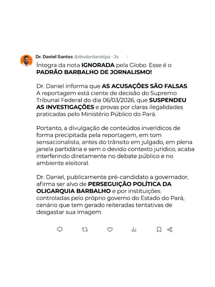 Em nota publicada em seu perfil, Daniel Santos afirmou que as acusações são falsas. Segundo ele, a reportagem teria ignorado uma decisão do Supremo Tribunal Federal (STF), datada de 6 de março de 2026, que teria suspendido as investigações e provas relacionadas ao caso. De acordo com o prefeito, a medida teria sido tomada após a identificação de supostas irregularidades na condução das apurações pelo Ministério Público do Pará.